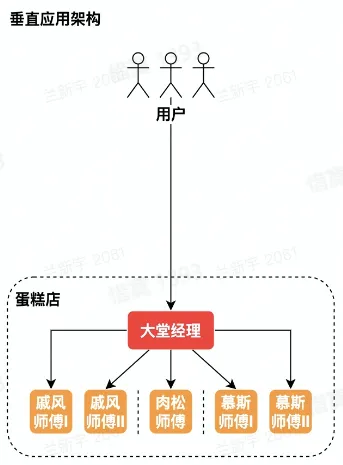 - 垂直应用架构:按应用垂直切分的单体