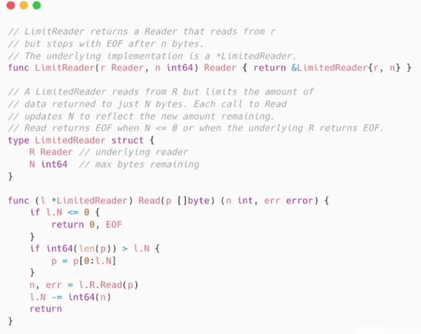 LimitedReader.Read本身没有注释,但他紧跟LimitedReader结构的声明,明确它的作用 - 有一个例外,不需要注释实现接口的方法,具体不要像下面这样做