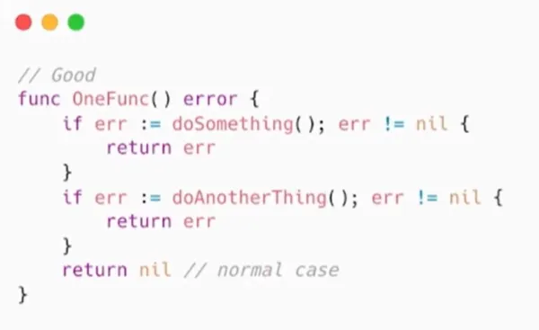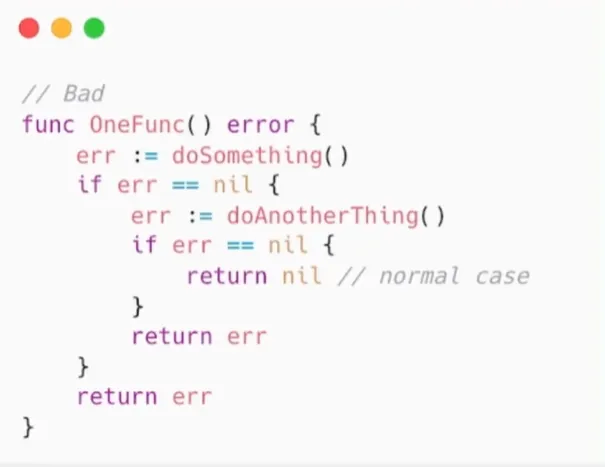 - 最常见的正常流程的路径被嵌套在两个 if 条件内