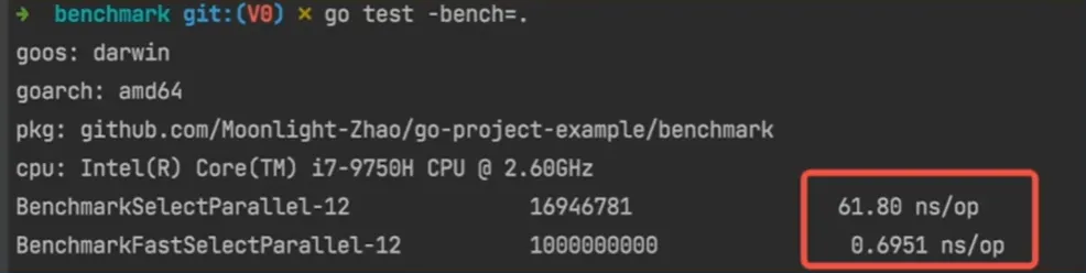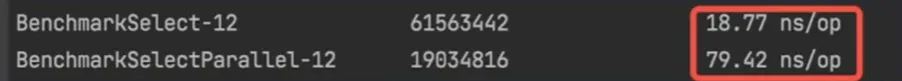 运行 1 2 3 4 5 6 7 8 9 10 11 12 13 14 15 16 17 func BenchmarkSelect (b *testing.B) { InitServerIndex() b.ResetTimer() for i := 0 ; i < b.N; i++ { Select() } } func BenchmarkSelectParallel (b *testing.B) { InitServerIndex() b.ResetTimer() b.RunParallel(func (pb *testing.PB) { for pb.Next() { Select() } }) }