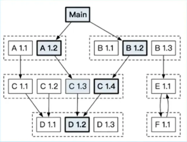 A.v1.3 B.v1.4 C.A 用到 C 时用 v1.3 编译,B 用到 C 时用 v1.4 编译