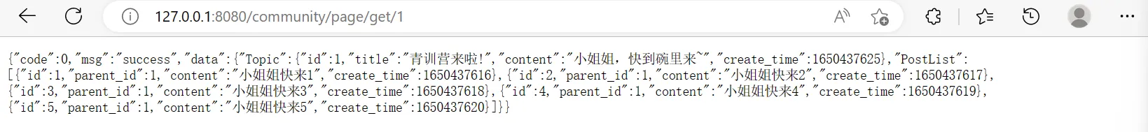 1 2 3 4 5 6 7 8 9 10 11 12 13 14 15 func main () { if err := Init("./data/" ); err != nil { os.Exit(-1 ) } r := gin.Default() r.GET("/community/page/get/:id" , func (c *gin.Context) { topicId := c.Param("id" ) data := cotroller.QueryPageInfo(topicId) c.JSON(200 , data) }) err := r.Run() if err != nil { return } }