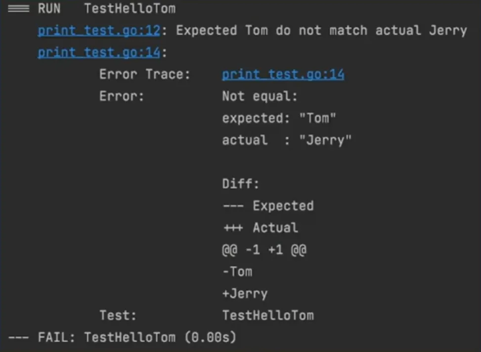 1 2 3 4 5 6 7 8 9 10 11 12 13 package testimport ( "testing" ) func TestHelloTom (t *testing.T) { output := HelloTom() expectOutput := "Tom" if output != expectOutput { t.Errorf("Expected %s do not match actual %s" , expectOutput, output) } }